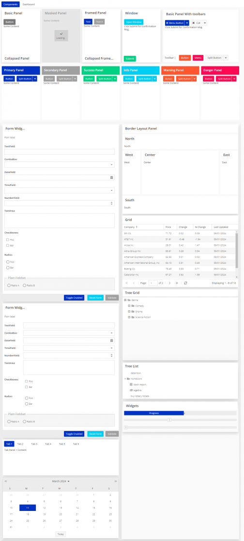 Every one of our theme package is built for a specific Ext JS toolkit and targets a specific major version of Ext JS, both of which you can choose while ordering the theme. Our themes are shipped built with standard Sencha packager and the output includes only the built theme and associated static resources, excluding the source code files used to produce the theme build. Although we take every care for a theme to support the maximum possible set of components from the target Ext JS version and toolkit, only a sub-set of the entire set of available Ext JS components are explicitly tested and supported. The supported components for the Standard Package are enumerated below.